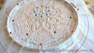 Sólo queda montar el atrapasueños. Con unos alfileres sujeto el bastidor centrándolo con el dibujo. Paso unas hebras por algunos picos de la labor y los ato al bastidor. Cuando ya está bien sujeto y centrado, puedo quitar todos los alfileres.