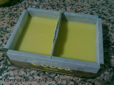 En esta foto está recién hecho, quedó muy líquido y no tenía muy claro que al final saliera algo. Pero sí, lo conseguí. La caja que utilicé de molde hace veinte años que me la guarde y por fin le he dado uso.